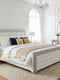 Glitter fabric Border Comes with a Unique Look, classic sleek range. Handmade with detailed precision. Quality solid straight slats improve comfort and mattress lifespan. The slats are manufactured with solid construction for superb durability. The headboard features a contemporary squared design with deep padding Vertical lines. The bed is upholstered can me made with your choice of color to match bedroom settings.