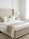 Wing Tufted Sleigh Comes with a Unique classic Chesterfield design . Handmade from start to finish. Quality solid straight slats improve comfort and mattress lifespan. The slats are manufactured with solid construction for superb durability. The headboard features a contemporary squared design with deep padding and a straight line pattern. The bed is upholstered can me made with your choice of colour to match bedroom settings.